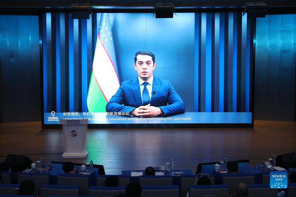 O. Tuychiev, deputy minister of innovative development of the Republic of Uzbekistan, gives a speech via video at the First Shanghai Cooperation Organization (SCO) Countries Parallel Forum Session of Zhongguancun Forum, on Sept. 26, 2021. (Zhongguancun Innoway/Handout via Xinhua)