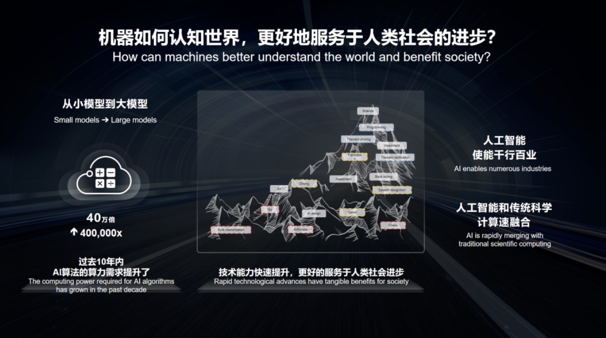 他介紹,通過AI模型的優(yōu)化可能幫助解決應(yīng)用碎片化的問題,這也引發(fā)了模型規(guī)模的爆發(fā)式增長。過去十年,AI算法的算力需求提升了四十萬倍。