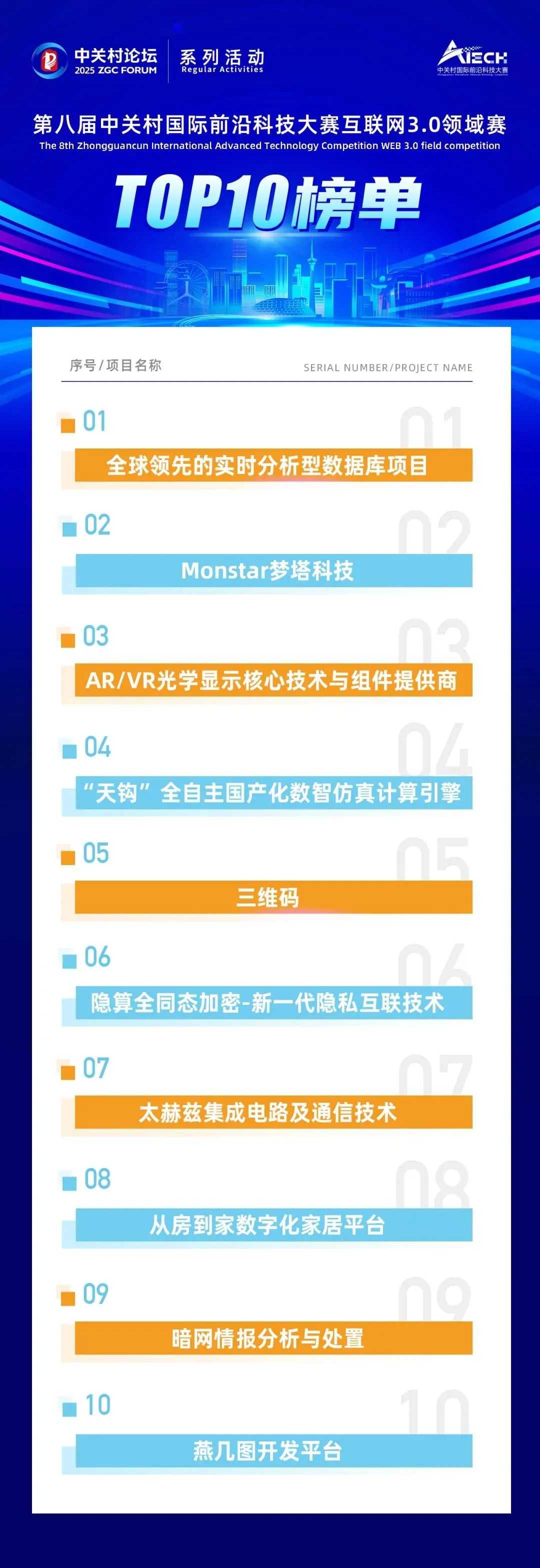 15個參賽項目爭先亮相,進行了激烈角逐。最終:全球領先的實時分析型數據庫項目、Monster夢塔科技、AR/VR光學顯示核心技術與組建提供商等10個項目脫穎而出,獲得第八屆中關村國際前沿科技大賽互聯(lián)網3.0領域TOP10榮譽稱號。