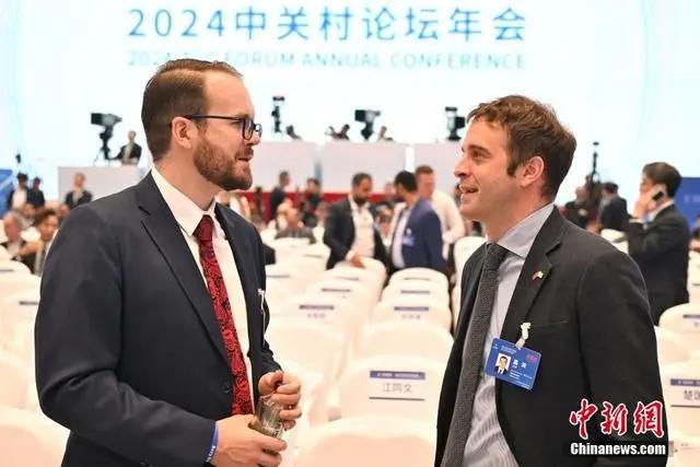 4月25日,2024中關(guān)村論壇年會在北京開幕。圖為與會嘉賓會前交流。中新社記者 田雨昊 攝