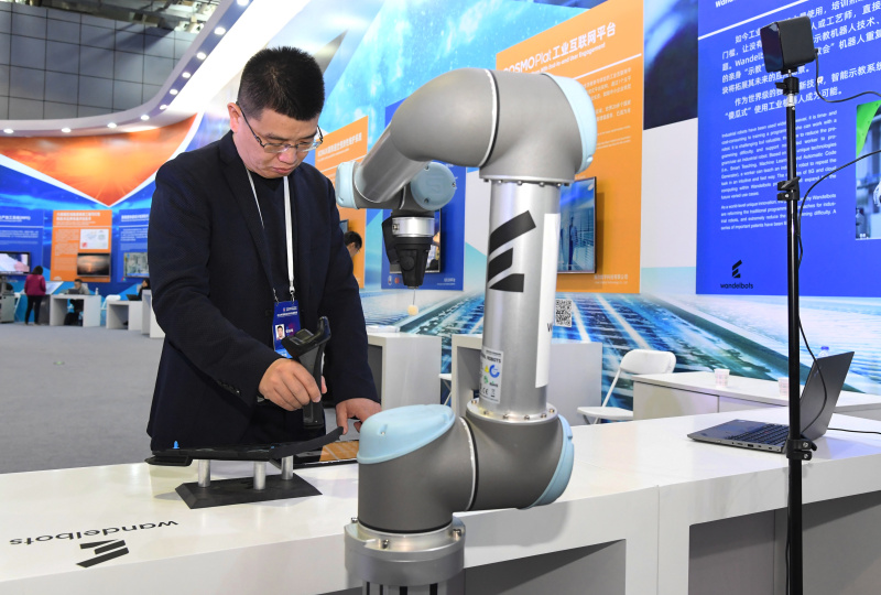 在2019中關(guān)村論壇中關(guān)村國際前沿科技成果展上,工作人員在展示工業(yè)機器人智能示教系統(tǒng)(10月16日攝)。 新華社發(fā)(任超 攝)