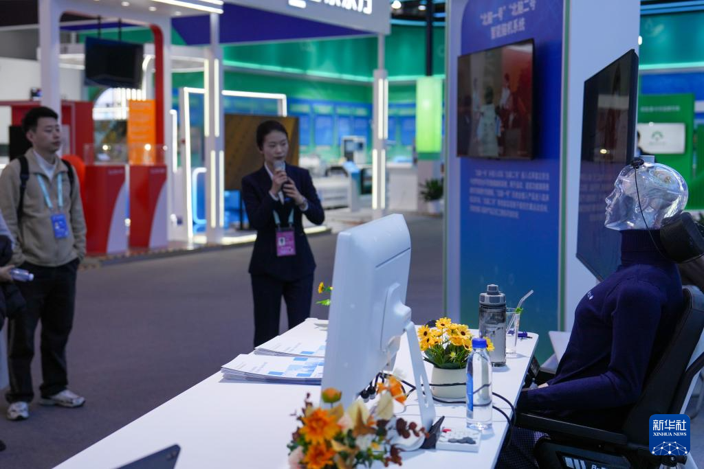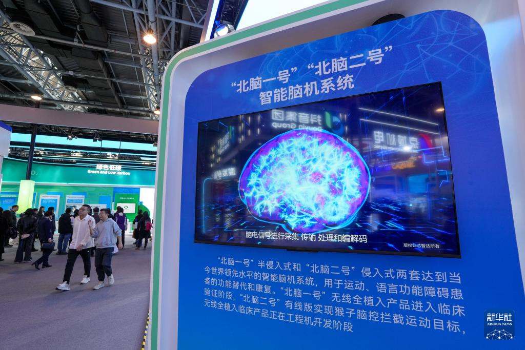 3月28日,在中關(guān)村展示中心常設(shè)展內(nèi),參觀者在聽取“北腦一號(hào)”“北腦二號(hào)”智能腦機(jī)系統(tǒng)介紹。