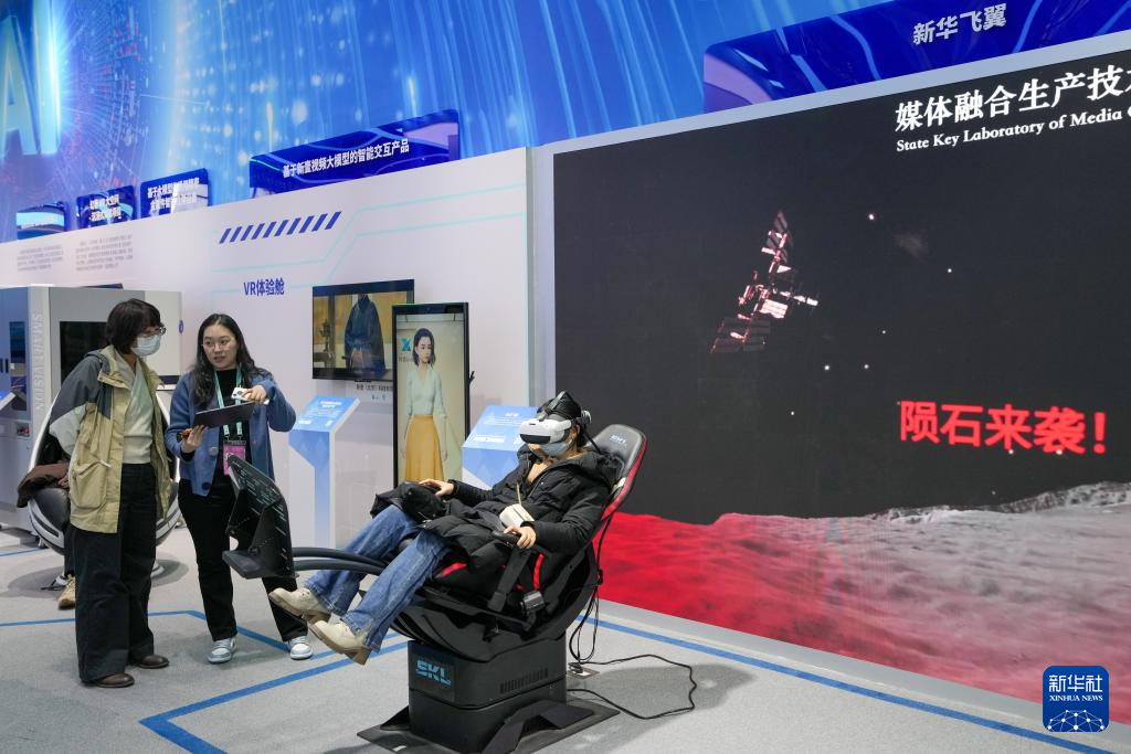 3月28日,在中關(guān)村展示中心常設(shè)展內(nèi),參觀者在“人工智能+”展示區(qū)域體驗(yàn)。