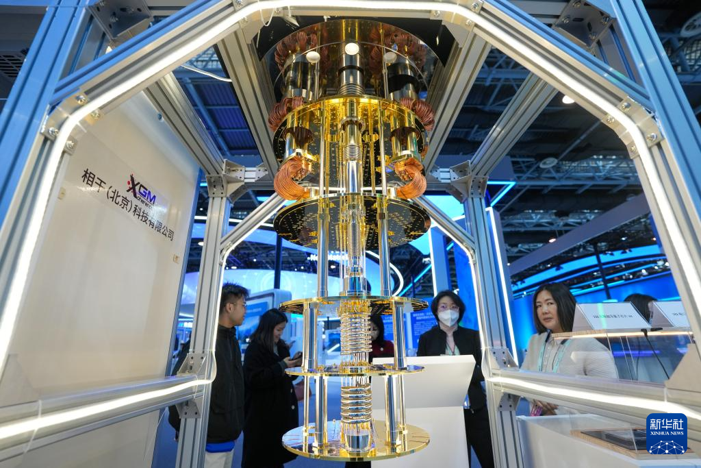 3月28日,在中關(guān)村展示中心常設(shè)展內(nèi),參觀者在了解展示的大型超導(dǎo)量子計(jì)算原型機(jī)。
