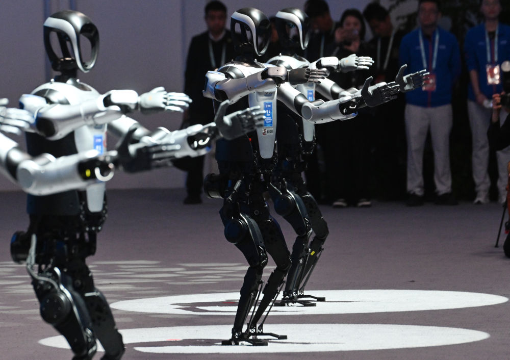 3月27日,人形機器人“夸父”在2025中關(guān)村論壇年會開幕式機器人秀環(huán)節(jié)中表演。新華社記者 張晨霖 攝