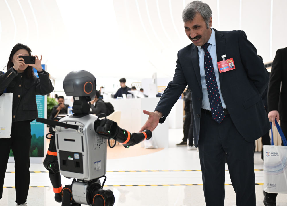 3月27日,與會嘉賓與一款加速T1機器人握手。新華社記者 張晨霖 攝