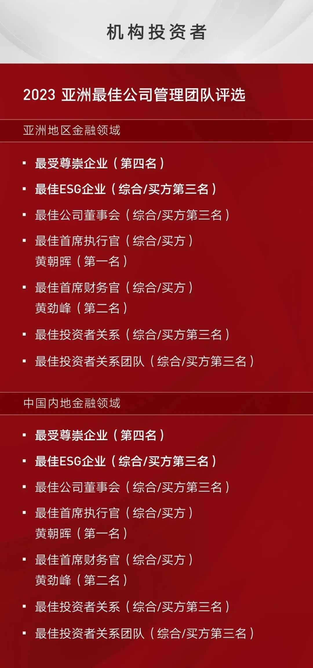 30多年來,《機構(gòu)投資者》致力于提供一系列金融服務(wù)領(lǐng)域?qū)I(yè)的排名和獎項,贏得了業(yè)界的高度尊重和認可。本屆2023亞洲最佳公司管理團隊評選客觀反映了來自1646家金融機構(gòu)、超過6000名金融和投資專業(yè)人士的意見。