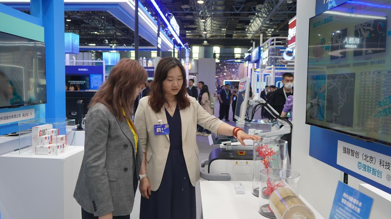 強聯(lián)智創(chuàng)創(chuàng)始人兼董事長秦嵐(右)講解“AI+治療”產(chǎn)品