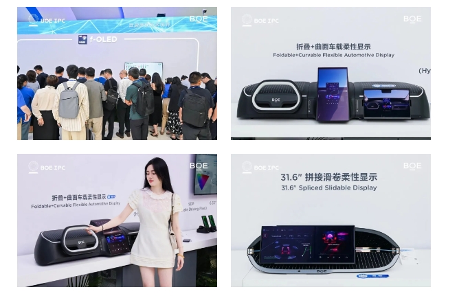 f-OLED展區(qū)內(nèi),京東方31.6英寸拼接滑卷柔性顯示產(chǎn)品可實(shí)現(xiàn)31.6英寸32:9、24.6英寸24:9、17.6英寸18:9三種尺寸四種顯示狀態(tài),可根據(jù)不同場景需求實(shí)現(xiàn)絲滑形態(tài)切換;另一款電動卷曲柔性顯示產(chǎn)品同樣“卷”出行業(yè)新高度,憑借5倍拓展顯示面積、4mm 最小卷曲半徑的出色表現(xiàn),極大地拓寬了柔性 OLED 的應(yīng)用場景。