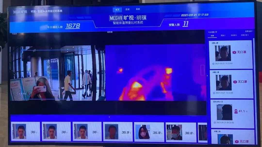 疫情期間舉辦如此規(guī)格與規(guī)模的論壇,防疫工作必然是重中之重。大會(huì)在關(guān)鍵區(qū)域和出入口布設(shè)睿家科技智能安檢測(cè)溫系統(tǒng)及曠視明驥智能體溫篩查比對(duì)系統(tǒng)。前者用于在安檢處快速核驗(yàn)個(gè)人健康防疫信息,后者用于在人員密集處快速篩查體溫。其中睿家科技智能安檢測(cè)溫系統(tǒng)可一秒七步合一,將身份識(shí)別、智能測(cè)溫、健康碼、核酸檢測(cè)、疫苗接種、公安聯(lián)網(wǎng)、電子登記七個(gè)環(huán)節(jié)在一秒鐘內(nèi)完成。
