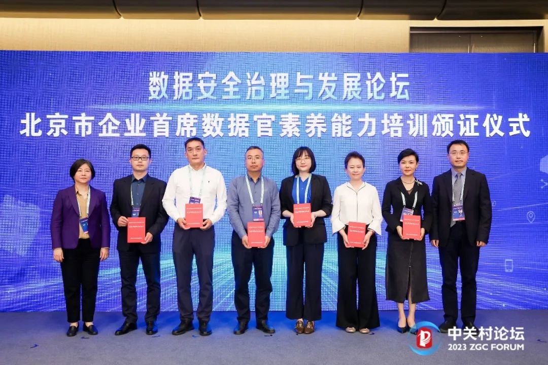 北京市經(jīng)信局、網(wǎng)信辦、人社局有關(guān)領(lǐng)導(dǎo)為首批北京市企業(yè)首席數(shù)據(jù)官頒發(fā)證書。
