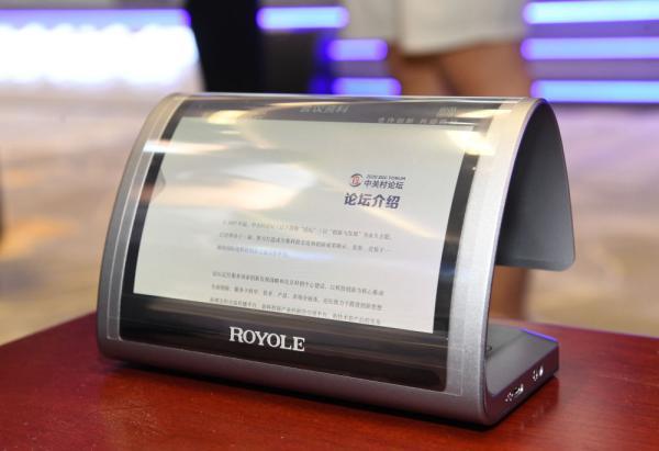 2020中關(guān)村論壇主會(huì)場(chǎng)會(huì)議廳中設(shè)置的柔性屏桌簽(9月16日攝)。