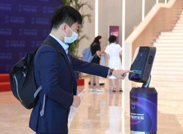 9月17日,在2020中關(guān)村論壇主會(huì)場(chǎng),與會(huì)人員通過(guò)服務(wù)機(jī)器人了解論壇信息。