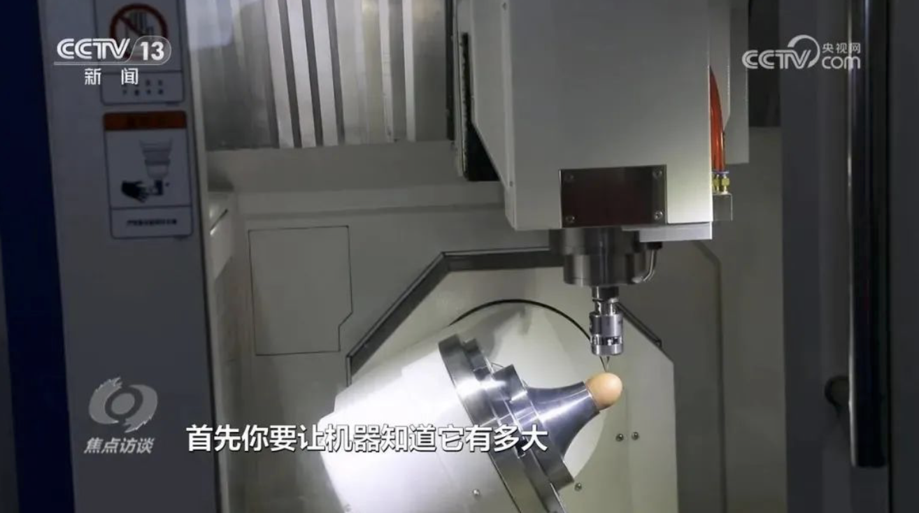 北京中關(guān)村精雕智造科技創(chuàng)新中心副總經(jīng)理楊錳:“一個是識別,給機床安上了一雙眼睛,能知道雞蛋長什么樣子;另外一個就是要求機床精度和穩(wěn)定性非常高,保證雞蛋永遠刻不爛、刻不破。”
