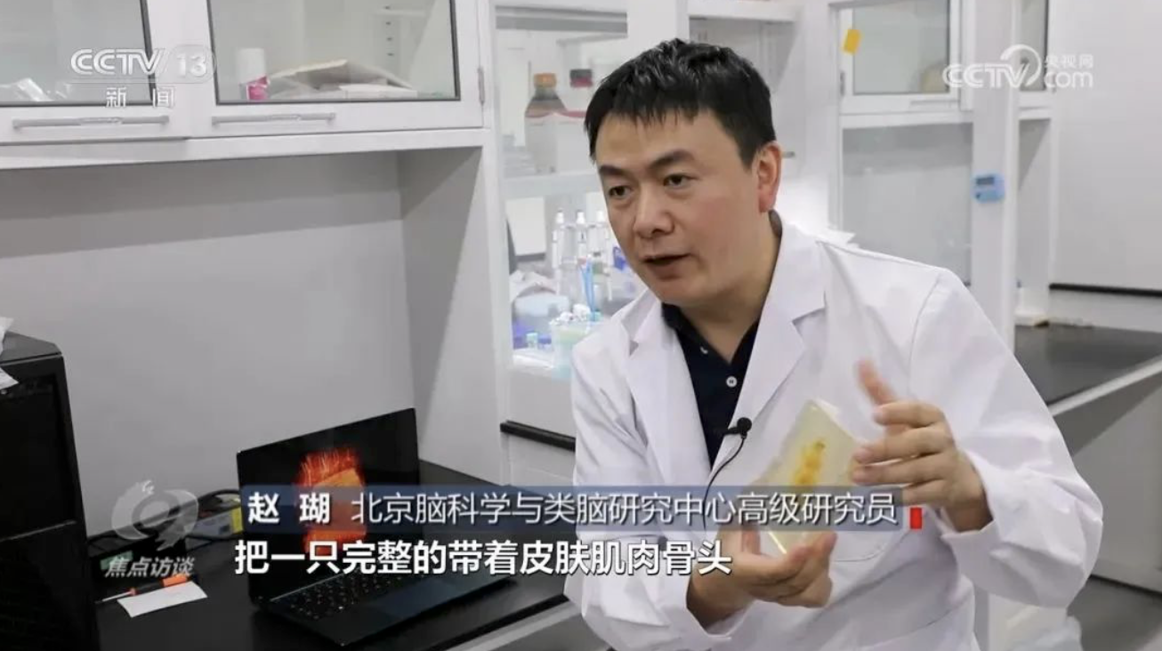 北京腦科學(xué)與類腦研究中心高級研究員趙瑚:“這是用我們實驗室所獨有的透明化技術(shù),把一只完整的帶著皮膚、肌肉、骨頭,以及所有內(nèi)臟器官的完整成體小鼠處理成透明的,但是它身體內(nèi)部所有神經(jīng)信號都完整保留下來了。”