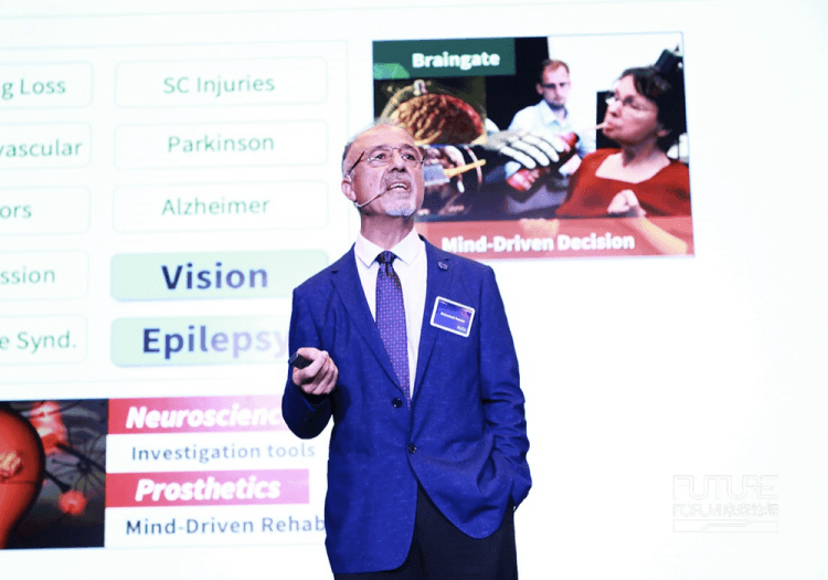 通過向大腦里植入芯片來治療人類頑疾,包括視力損失、聽力損失,甚至像癲癇、帕金森癥、白癲風(fēng)這些可怕的病……聽到這兒頭皮是不是有點(diǎn)激動(dòng)的發(fā)麻?聆聽這樣的主旨演講就像坐上了一輛過山車,能夠跟隨睿智的演講實(shí)現(xiàn)智識(shí)的新飛躍。