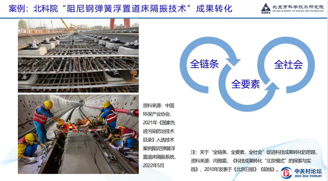 他分享了科研機(jī)構(gòu)促進(jìn)科技成果轉(zhuǎn)化應(yīng)該具有的四個(gè)關(guān)鍵要素,即科技成果“有的轉(zhuǎn)”;科研機(jī)構(gòu)“有權(quán)轉(zhuǎn)”;科研人員“愿意轉(zhuǎn)”;條件配套“順利轉(zhuǎn)”,以及促進(jìn)科技成果轉(zhuǎn)化的五個(gè)著力點(diǎn):一是“牽引器”,堅(jiān)持需求導(dǎo)向、問題導(dǎo)向、應(yīng)用導(dǎo)向;二是“加速器”,加強(qiáng)中試熟化平臺(tái)建設(shè);三是“指揮棒”,完善科技成果評(píng)價(jià)體系;四是“營(yíng)養(yǎng)液”,完善科技成果轉(zhuǎn)化配套條件;五是“催化劑”,加強(qiáng)科技成果轉(zhuǎn)化機(jī)構(gòu)和人才隊(duì)伍建設(shè)。并以北科院“阻尼鋼彈簧浮置道床隔振技術(shù)”成果轉(zhuǎn)化為例,介紹了“全鏈條、全要素、全社會(huì)”促進(jìn)科技成果轉(zhuǎn)化的思路、探索和實(shí)踐。