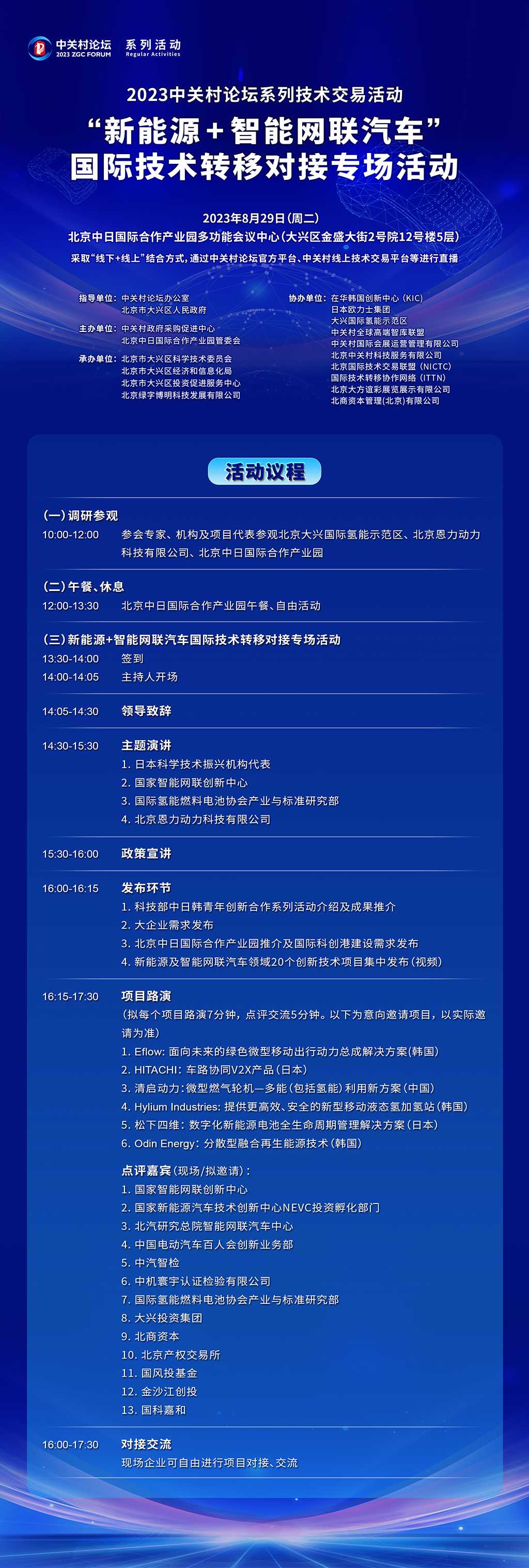 本次活動由中關(guān)村論壇辦公室和北京市大興區(qū)人民政府指導(dǎo),中關(guān)村政府采購促進(jìn)中心、北京中日國際合作產(chǎn)業(yè)園管委會主辦,北京市大興區(qū)科學(xué)技術(shù)委員會、北京市大興區(qū)經(jīng)濟(jì)和信息化局、北京市大興區(qū)投資促進(jìn)服務(wù)中心、北京綠字博明科技發(fā)展有限公司承辦,在華韓國創(chuàng)新中心(KIC)、日本歐力士集團(tuán)、大興國際氫能示范區(qū)、中關(guān)村全球高端智庫聯(lián)盟等共同協(xié)辦。