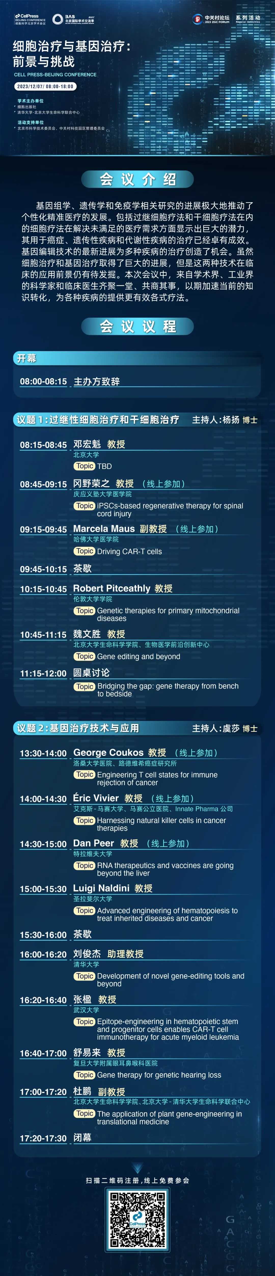 2023中關(guān)村論壇系列活動(dòng)暨北京國(guó)際學(xué)術(shù)交流季——細(xì)胞治療與基因治療:前景與挑戰(zhàn)將于12月7日召開,活動(dòng)由北京市科學(xué)技術(shù)委員會(huì)、中關(guān)村科技園區(qū)管理委員會(huì)支持,細(xì)胞出版社和清華大學(xué)-北京大學(xué)生命科學(xué)聯(lián)合中心共同舉辦。會(huì)議邀請(qǐng)了來自學(xué)術(shù)界、工業(yè)界的科學(xué)家和臨床醫(yī)生齊聚一堂、共商其事,以期加速當(dāng)前的知識(shí)轉(zhuǎn)化,提供更有效的醫(yī)療范式。我們將聚焦過繼性細(xì)胞治療、干細(xì)胞治療、基因遞送方式、體內(nèi)基因治療等方面的最新突破、討論基因和細(xì)胞治療產(chǎn)品的安全性,以及應(yīng)用這些療法在促進(jìn)人類健康過程中的挑戰(zhàn)。