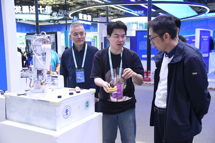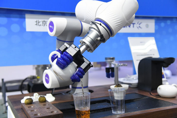 4月28日在中關(guān)村展示中心常設(shè)展中拍攝的智慧互動(dòng)-機(jī)器人茶藝平臺(tái),可代替人手完成提、點(diǎn)、按、倒、移等動(dòng)作的高柔性無(wú)損抓取。